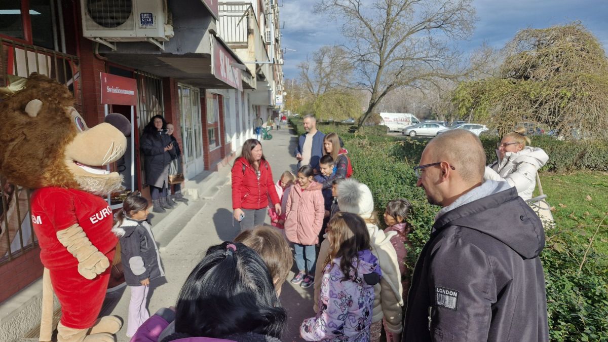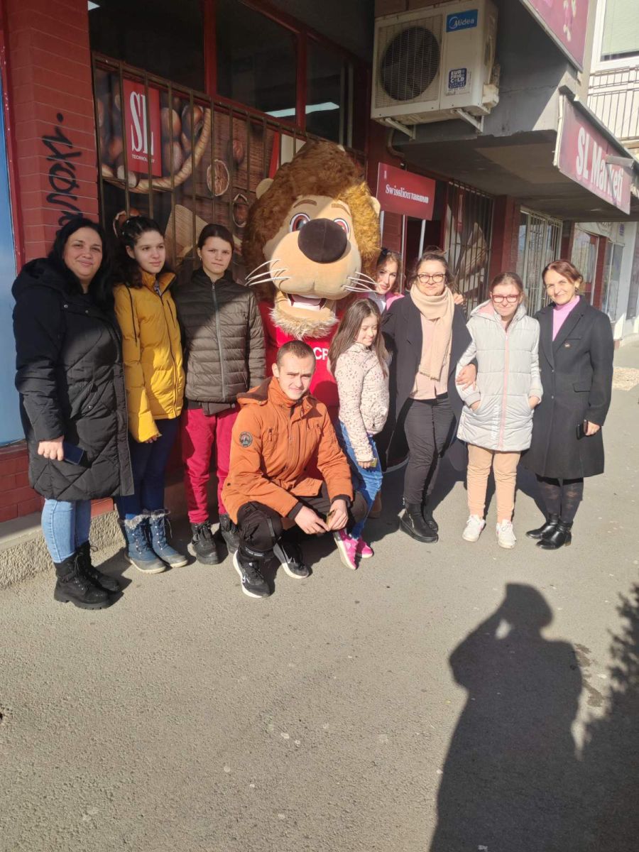 Данас су наши ученици позвани на малу дегустацију и промоцију слаткиша које је организовала компанија SWISSLION-TAKOVO.Они су наше драге комшије и донатори новогодишњих пакетића за наше ученике.Дан је био леп и сунчан и неминовно је било сликање са њиховом маскотом .